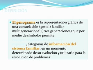 El genograma permite representar gráficamente la estructura y las relaciones de una familia a través de generaciones. Muestra la organización de los miembros por generación, sexo y edad, así como eventos vitales como nacimientos, muertes, divorcios y enfermedades. También revela pautas de funcionamiento, como las relaciones entre miembros y la transmisión de estas a lo largo del tiempo, lo que ayuda a comprender problemas actuales. El genograma proporciona información sobre la adaptación de la familia a diferentes etapas del c