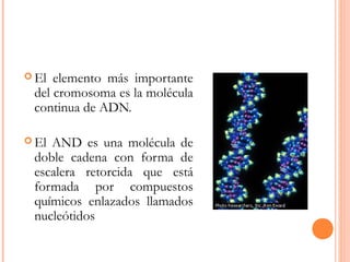 El documento describe el ADN y el genoma humano. Explica que el ADN es una molécula de doble cadena formada por nucleótidos unidos que contienen la información genética. El genoma humano contiene aproximadamente 31,000 genes distribuidos en 23 pares de cromosomas. El Proyecto Genoma Humano secuenció el genoma y mapeó la ubicación de los genes para ayudar a relacionar enfermedades con genes específicos.