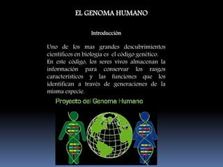 El documento resume los conceptos clave del genoma humano, incluyendo que un genoma contiene todo el material genético de un organismo en forma de ADN, que los genes contienen instrucciones para producir proteínas que dan características a los organismos. Explica que el Proyecto Genoma Humano buscó descubrir entre 30,000 y 35,000 genes humanos y que el genoma humano contiene aproximadamente 3,000 millones de pares de bases de ADN distribuidos en 23 pares de cromosomas. También resume los principios éticos