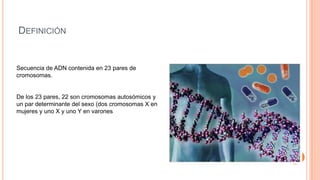 El documento describe las características principales del genoma humano. El genoma humano contiene la secuencia de ADN de los 23 pares de cromosomas, incluyendo aproximadamente 20,000-25,000 genes que codifican proteínas. Las proteínas, y no el ADN, son las principales biomoléculas que desempeñan funciones estructurales y metabólicas en el cuerpo. Las alteraciones en la secuencia de ADN pueden causar enfermedades genéticas como trastornos monogénicos y poligénicos.