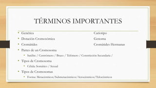 El documento resume los principales conceptos y leyes de la genética de Mendel. Explica términos como cromosomas, alelos, genotipo y fenotipo. Describe los experimentos pioneros de Mendel con guisantes, incluidos los rasgos estudiados y sus hallazgos clave sobre la herencia de rasgos dominantes y recesivos en proporciones predecibles. Las tres leyes de Mendel explican la uniformidad de los caracteres, la segregación independiente de los alelos y la independencia de múltiples pares de caracteres.