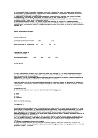 Este documento resume la genética del color en los caballos. Explica que existen dos pigmentos principales, eumelanina (negro) y faeomelanina (rojo), controlados cada uno por un alelo. También describe varios genes diluyentes como el gen Agouti que produce caballos colorados y el gen Crema que produce caballos bayos y alazanes ruanos cuando hay un alelo presente o caballos perlinos/cremellos cuando hay dos alelos presentes. Finalmente, discute la terminología usada para describir los diferentes colores en la