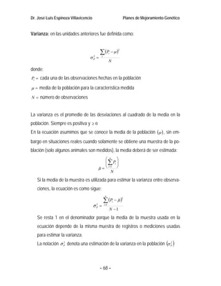 El documento describe los conceptos fundamentales de la genética cuantitativa, incluyendo la varianza, covarianza y correlación. Explica que la genética cuantitativa es la más importante de las tres áreas de genética para el mejoramiento genético debido a que la selección en características cuantitativas tiene un mayor valor económico. También describe cómo estimar parámetros genéticos como la heredabilidad usando métodos estadísticos como la covarianza entre registros de animales emparentados.