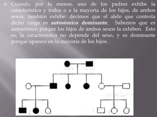 El documento describe varios rasgos genéticos humanos, incluyendo si son dominantes o recesivos. Explica que los lóbulos de la oreja adheridos son homocigotos para un gen recesivo, el pulgar de "ponero" es determinado por un gen recesivo, y la presencia de pelo en los dedos es dominante. También describe la herencia de características como el color de ojos, cabello, y la forma de la nariz.