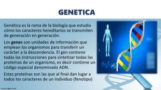La genética es la rama de la biología que estudia la transmisión de caracteres hereditarios a través del ADN, que contiene la información necesaria para la síntesis de proteínas que determinan el fenotipo del individuo. El comportamiento humano es influenciado tanto por factores genéticos como por el entorno, incluyendo la cultura y las normas sociales, y tiene un papel crucial la salud mental en su manifestación. La interacción entre genética y ambiente determina la susceptibilidad a ciertas características conductuales, evidenciando la importancia de la genética en la psicología del comportamiento.