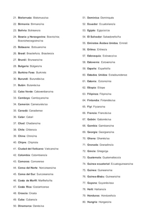 Este documento lista los gentilicios de las 25 regiones de Perú y los gentilicios de todos los países del mundo en orden alfabético. Proporciona el nombre gentilicio de cada región peruana y país, con su forma femenina y masculina cuando corresponde.