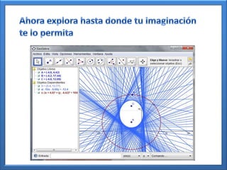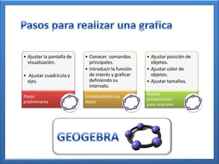 Este documento presenta una guía sobre cómo usar el programa Geogebra para graficar funciones. Explica cómo ajustar la pantalla de visualización, conocer los comandos principales, y ajustar la posición y color de objetos. También cubre cómo introducir una función matemática usando la jerarquía correcta de operaciones y graficarla definiendo su intervalo. Finalmente, recomienda ajustar la presentación para mejorar la visualización y comprensión del trabajo realizado.