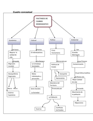 El documento habla sobre los conflictos entre la sociedad y el medio ambiente causados por la revolución industrial, el capitalismo y el desarrollo tecnológico. Estos factores han provocado la explotación de los recursos naturales, la contaminación y el desequilibrio ecológico. También menciona los diferentes enfoques de conservación y manejo de recursos para mejorar la calidad de vida y las relaciones entre la naturaleza y la sociedad.