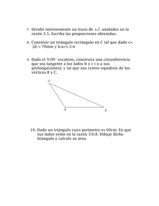 El documento presenta 10 ejercicios de geometría para construir figuras geométricas como triángulos, rectángulos y circunferencias. También incluye cálculos para dividir segmentos y hallar el centro de gravedad de un triángulo. Por último, explica conceptos básicos sobre elementos de una circunferencia como radio, diámetro, cuerda y área de sectores circulares.