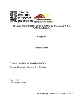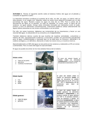 El documento presenta información sobre el balance hídrico mundial. Explica que el agua dulce solo representa el 5% del agua total, mientras que el 95% restante es agua salada. Además, señala que el 30% del agua es subterránea, mientras que los ríos y lagos representan solo el 5%. Finalmente, destaca que el uso principal del agua es para la agricultura y ganadería, que representa el 70% del consumo total de agua.