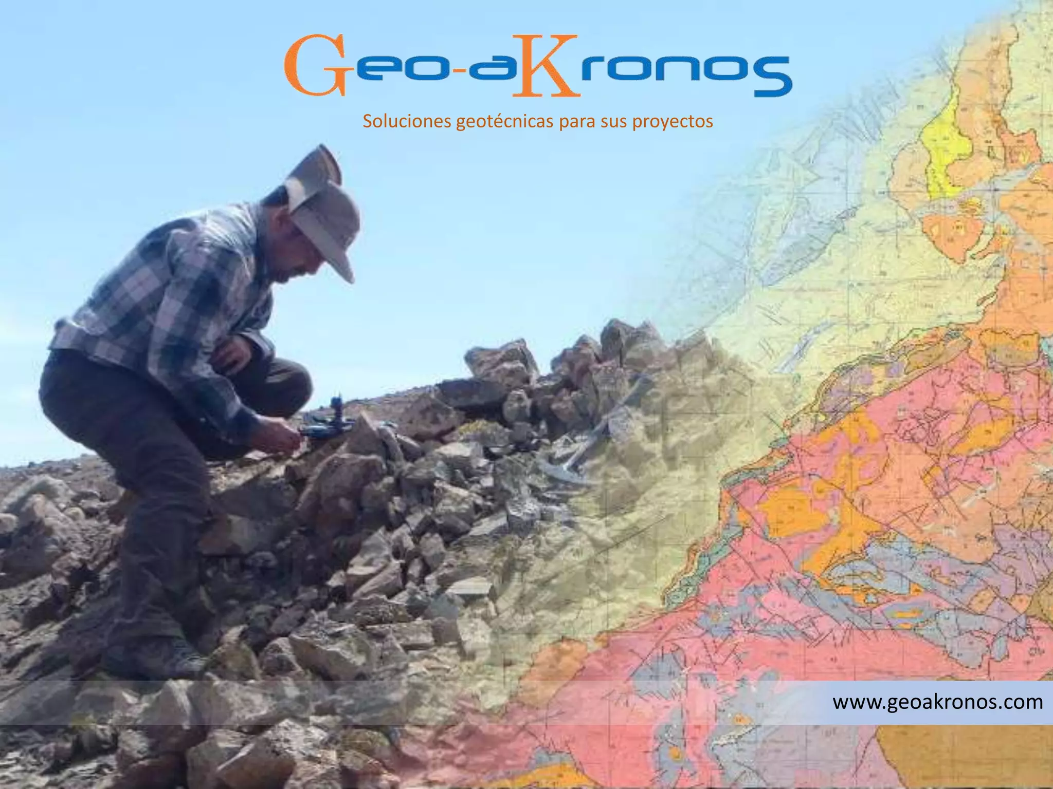 Este documento presenta los servicios de ingeniería geotécnica ofrecidos por la compañía Geoakronos, incluyendo exploración del subsuelo, estudios geotécnicos, cartografía, energías renovables, ingeniería civil, taludes, túneles, minería, hidrología e hidrogeología, estudios geofísicos, y topografía. La compañía ofrece soluciones geotécnicas para proyectos a través de la planificación de campañas de sondeo, ejecución de ensayos in
