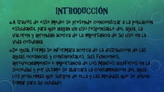 Este documento busca concientizar sobre el uso responsable del agua y su importancia. Explica que aunque el agua parece abundante, solo una pequeña porción es apta para el consumo humano. Detalla las funciones de las aguas oceánicas y continentales, la importancia de los mantos acuíferos y los problemas de contaminación. Concluye que el agua es vital para la vida y que debemos cuidarla.
