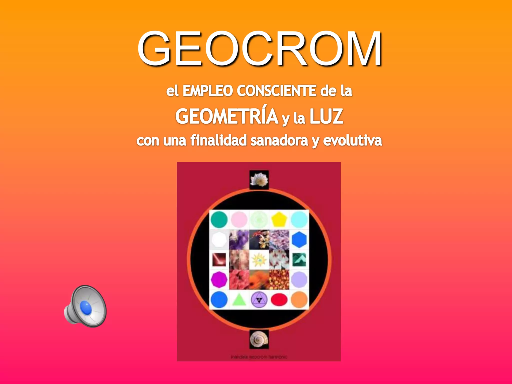 Este documento describe cómo la geometría es el lenguaje subyacente de la armonía y la naturaleza. Explica que todos los seres vivos, incluidos los humanos, están compuestos de patrones geométricos y proporciones matemáticas. Además, introduce el sistema Geocrom, que usa patrones geométricos de colores proyectados sobre puntos de acupuntura para estimular las células y canales energéticos con el objetivo de activar la autorregulación y curación del cuerpo.