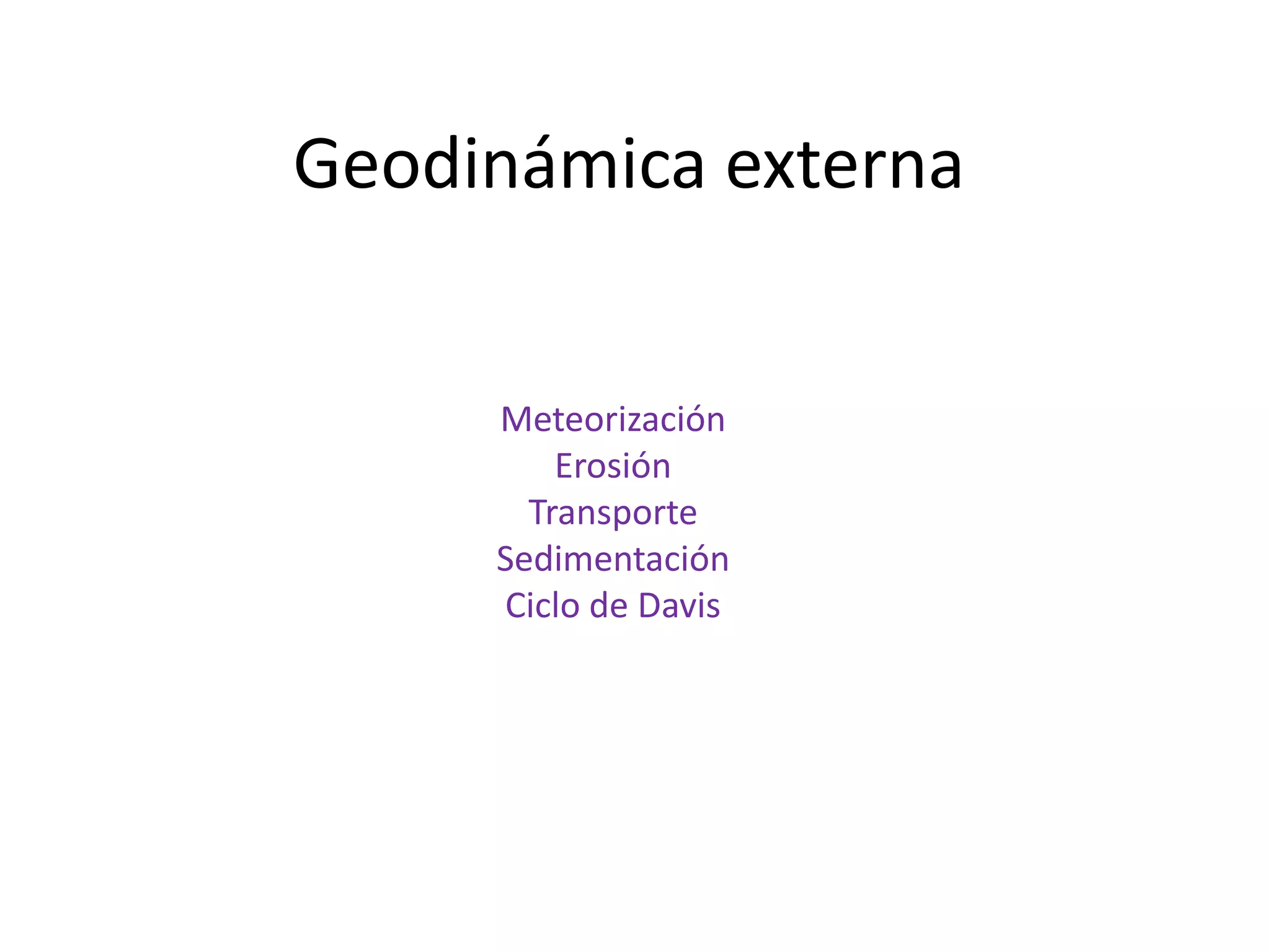 La geodinámica externa estudia las modificaciones de la superficie terrestre. Los agentes geológicos externos como el agua, el hielo y el viento destruyen el relieve mediante procesos de meteorización, erosión y transporte. Los sedimentos son depositados en otras zonas, dando lugar al ciclo de Davis que transforma el paisaje desde su elevación inicial hasta volver al nivel del mar.