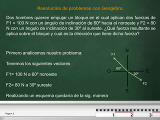 Dos hombres aplican fuerzas de 100 N a 60° noroeste y 80 N a 30° sureste sobre un bloque. Para encontrar la fuerza resultante, se representan los vectores en GeoGebra usando coordenadas polares. La suma de vectores da como resultado una fuerza de 141.42 N formando un ángulo de 48.69° noreste.