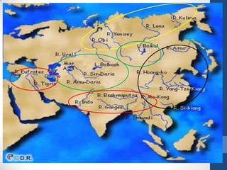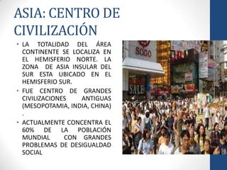 Asia es el continente más grande del mundo, con una superficie de 44.2 millones de km2 y una población de 3.9 mil millones de habitantes. Se caracteriza por su gran diversidad física que incluye las principales montañas y ríos del mundo como el Himalaya y el Yangtsé, así como grandes llanuras aluviales y desiertos. Ha sido cuna de importantes civilizaciones antiguas y actualmente concentra el 60% de la población mundial con grandes desafíos de desigualdad. El continente se divide en varias region