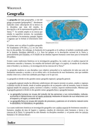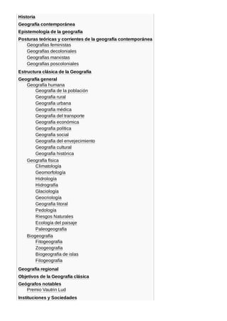 La geografía es la disciplina que estudia la Tierra, incluyendo tanto aspectos físicos como humanos. Se originó en la antigua Grecia y ha evolucionado a lo largo de la historia, desarrollándose de manera diferente en distintas culturas. Actualmente se divide en geografía física, que estudia el medio ambiente natural, y geografía humana, que analiza las interacciones entre los seres humanos y el espacio.