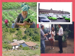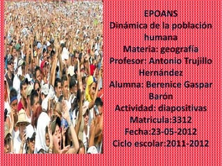 El documento presenta información sobre la dinámica de la población humana. Explica que la población se ve influenciada por factores como el clima, relieve, vegetación, hidrografía y suelo. También describe conceptos demográficos como natalidad, mortalidad, migración y crecimiento poblacional. Finalmente, analiza las características de las poblaciones rurales y urbanas.