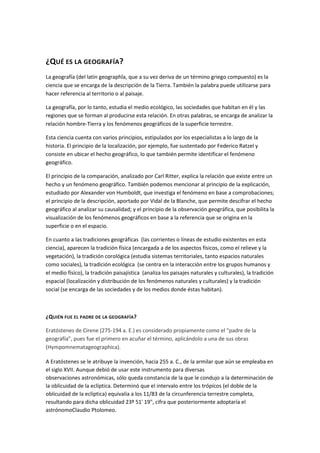 El documento proporciona una introducción a la geografía como disciplina académica. Explica que la geografía estudia la relación entre los seres humanos y la Tierra, y analiza los principios y tradiciones de esta ciencia. También identifica a Eratóstenes como el "padre de la geografía" y a Alejandro von Humboldt como el "padre de la geografía moderna". Finalmente, resume las diferentes etapas en el desarrollo de la geografía como una disciplina científica.