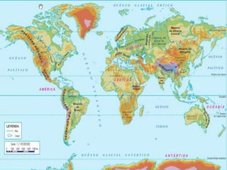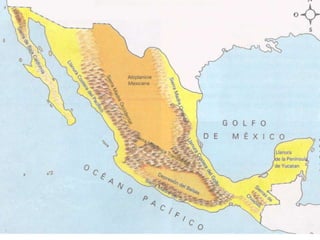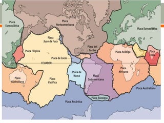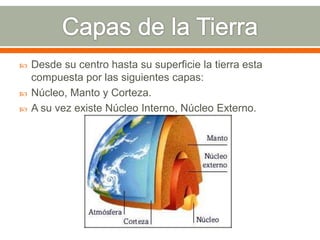 La Tierra está compuesta de varias capas, incluido el núcleo, el manto y la corteza. La litosfera está fragmentada en placas tectónicas que se mueven, causando vulcanismo y sismicidad, especialmente en México debido a las placas de Cocos y del Pacífico. La hidrosfera incluye océanos, mares, ríos y lagos. La atmósfera contiene varias capas y fenómenos meteorológicos como la temperatura, humedad y precipitación.