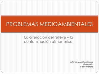 Este documento resume los principales problemas medioambientales derivados de la alteración del relieve y la contaminación atmosférica. El relieve se ve afectado por el crecimiento urbano, infraestructuras, actividades extractivas y el turismo. La contaminación atmosférica incluye emisiones de dióxido de azufre, monóxido de carbono e hidrocarburos que forman smog y lluvia ácida, afectando a la salud y el medio ambiente. El cambio climático también altera el clima a escala global.