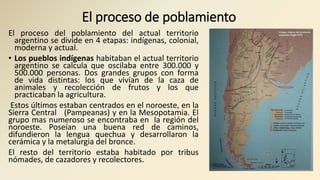 Este documento describe el proceso de poblamiento de Argentina a través de las distintas etapas históricas, la distribución actual de la población, y los indicadores demográficos clave. Explica que la población se distribuyó de manera desigual debido a factores naturales e históricos, y que actualmente está envejeciendo y creciendo a una tasa más baja debido a menores tasas de natalidad e inmigración. Además, analiza las diferencias demográficas entre las provincias argent