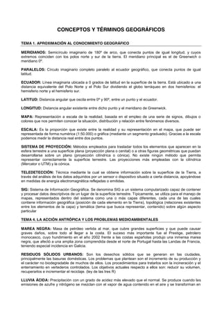 Este documento proporciona definiciones de varios términos y conceptos geográficos relacionados con la geografía física y humana de España. Incluye definiciones de conceptos básicos como meridianos, paralelos, latitud y longitud, así como términos relacionados con el relieve español como meseta, páramo y campiña. También define conceptos climáticos como anticiclón, borrasca, continentalidad y lluvias orográficas. Por último, explica algunos problemas ambientales como marea negra