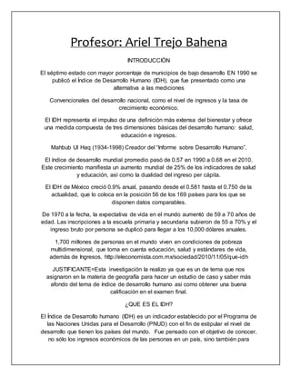 Este documento resume el Índice de Desarrollo Humano (IDH), un indicador creado por el Programa de las Naciones Unidas para el Desarrollo (PNUD) para medir el desarrollo de los países considerando factores como esperanza de vida, educación e ingresos. Explica que el IDH de México ha crecido en las últimas décadas aunque persisten desigualdades a nivel municipal. Señala que Hidalgo es el séptimo estado mexicano con mayor porcentaje de municipios de bajo desarrollo según el