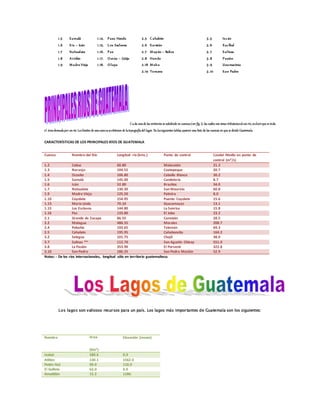El documento describe las tres principales vertientes hidrológicas de Guatemala, las cuales son la Vertiente del Pacífico, la Vertiente del Atlántico y la Vertiente del Golfo de México. Cada vertiente se subdivide en cuencas que drenan los ríos. También se proporciona información sobre los principales lagos y volcanes del país.