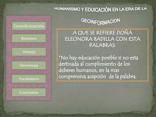 Este documento discute la importancia de la geoinformación y las habilidades que brinda. Explica que la geoinformación permite a las personas y las instituciones acceder y utilizar información de manera fluida para enfrentar los desafíos actuales. También destaca que es necesario educar a las personas para que puedan usar la información de forma racional e independiente y desarrollar habilidades competitivas en geoinformación.
