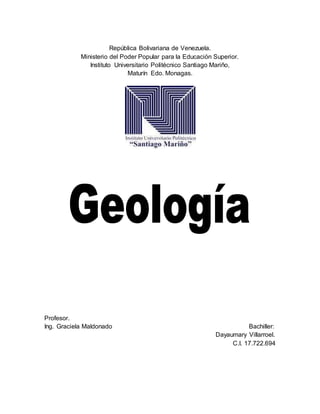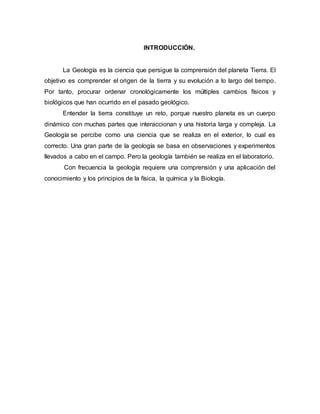 Este documento provee una introducción a la geología, describiendo sus objetivos y métodos. También describe los principios básicos de la geología como el uniformismo y el actualismo. Explica cómo la geología se aplica en varias áreas de ingeniería como obras hidráulicas, viales y edificaciones. Finalmente, brinda detalles sobre las rocas, sus características y clasificaciones.