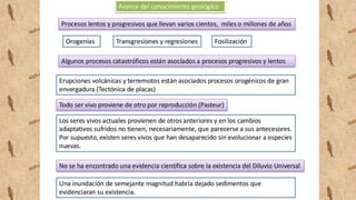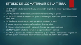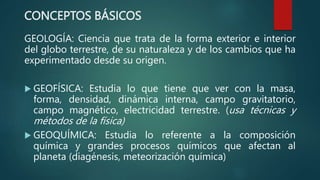 Este documento describe las diferentes disciplinas y conceptos básicos de la geología. Explica que la geología estudia la forma y composición interna y externa de la Tierra, así como los cambios que ha experimentado a lo largo del tiempo. También cubre ramas relacionadas como la geofísica, gequímica, mineralogía, petrología, geocronología y paleontología. Además, describe técnicas como la cartografía geológica y la metodología científica empleada en esta disciplina.