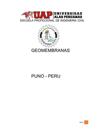 Este documento describe las aplicaciones de las geomembranas en la ingeniería civil. Discute brevemente las geomembranas de PVC y HDPE, y explica que las geomembranas se usan comúnmente en rellenos sanitarios, depósitos de lixiviado, canales, acuicultura, reservorios de agua, minería y otras aplicaciones para proveer impermeabilización y prevenir la contaminación. También resalta la importancia de usar geomembranas para prevenir cambios de volumen en suelos arcillosos y la migración de