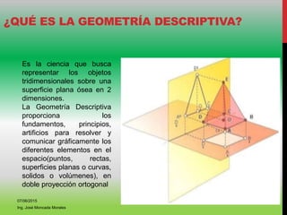 Este documento presenta los conceptos fundamentales de la geometría descriptiva, incluyendo la representación de objetos tridimensionales en dos dimensiones mediante proyecciones ortogonales, la teoría de proyección de puntos, rectas, planos y sólidos, y el estudio de posiciones relativas como paralelismo, perpendicularidad e intersección. El documento también cubre técnicas para medir ángulos y distancias en el espacio tridimensional.