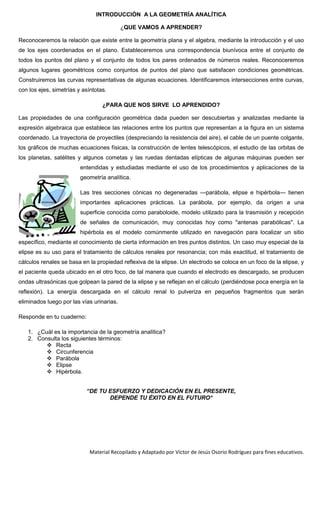 La geometría analítica conecta la geometría y el álgebra mediante la representación de figuras geométricas con expresiones algebraicas usando coordenadas. Históricamente, Pitágoras sistematizó la geometría demostrativa usando axiomas y postulados, mientras que Descartes estableció la conexión entre geometría y álgebra al demostrar cómo aplicar los métodos de una disciplina en la otra, dando origen a la geometría analítica. La geometría analítica permite analizar propiedades geométricas mediante expresiones