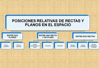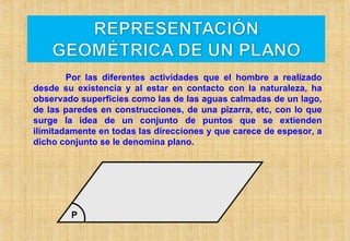 El documento define el plano geométrico como un conjunto de puntos que se extienden ilimitadamente en todas direcciones sin espesor. Explica que tres puntos no colineales, una recta y un punto que no pertenece a ella, dos rectas secantes o paralelas determinan un plano único. También describe las relaciones geométricas entre planos, como planos secantes que comparten una línea de intersección, y planos paralelos que no se intersectan.
