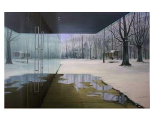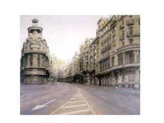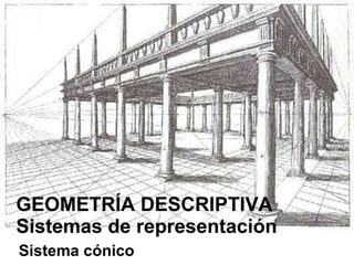Este documento describe los diferentes sistemas de representación geométrica utilizados para dibujar objetos tridimensionales en un plano bidimensional. Se explica el sistema cónico, que utiliza la proyección cónica para simular la percepción humana de volumen y profundidad. Se detallan los elementos del sistema cónico como el punto de vista, los planos y las líneas de horizonte y tierra. Finalmente, se describen los procedimientos para realizar perspectivas cónicas frontales y oblicuas de figuras como cubos y conos.