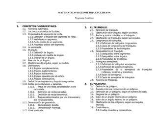 Este documento presenta el programa analítico para el curso de Matemáticas II sobre geometría euclidiana. El curso cubrirá conceptos fundamentales como puntos, líneas, ángulos y figuras geométricas. Se estudiarán en detalle el triángulo, polígonos y el círculo. El objetivo es que los estudiantes dominen las propiedades y relaciones geométricas para resolver problemas.