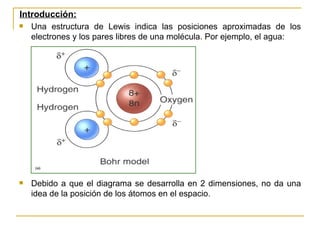 Este documento describe dos modelos para representar la estructura molecular: el diagrama de Lewis y el modelo de repulsión del par electrónico del nivel de valencia (RPENV). El diagrama de Lewis muestra las posiciones aproximadas de los electrones y pares libres pero no la posición espacial de los átomos. El modelo RPENV surge para representar la posición espacial basándose en que los electrones se ubican lo más alejados posible debido a la repulsión. Este modelo tiene en cuenta el número de pares electrónicos del átomo central para de