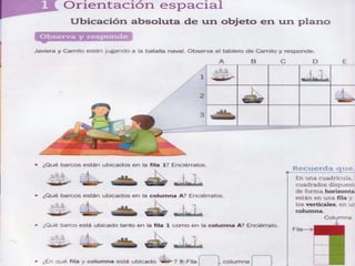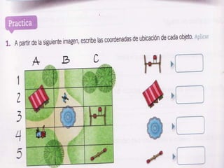 El documento describe cómo usar coordenadas en un plano para ubicar un objeto de manera exacta. Explica que las filas son los cuadrados horizontales y las columnas los verticales. Alienta a la práctica de estas nociones de orientación espacial para describir ubicaciones en un plano.