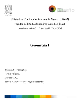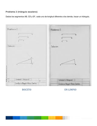 El documento presenta una serie de actividades de geometría plana para la asignatura de Diseño y Comunicación Visual en la UNAM. Incluye problemas sobre la construcción de diferentes tipos de triángulos y figuras geométricas como cuadrados, rectángulos, rombos y hexágonos. Cada problema requiere la elaboración de un boceto en limpio conforme a las especificaciones dadas.