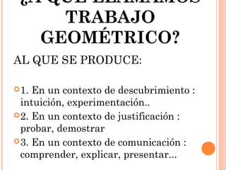 Este documento describe el trabajo geométrico, las condiciones para que una propuesta sea considerada un problema geométrico, y los conocimientos previos necesarios para resolver problemas geométricos. También discute la importancia de usar una variedad de actividades como representación, copia, clasificación y comunicación para enseñar geometría, y los materiales como tangram, geoplanos y software que pueden usarse.
