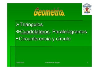 El documento presenta información sobre geometría que incluye triángulos, cuadriláteros, paralelogramos, circunferencias y círculos. Explica los elementos básicos de estos objetos geométricos, cómo clasificarlos y calcular sus medidas. El objetivo es que los estudiantes reconozcan y comprendan estas figuras geométricas fundamentales.