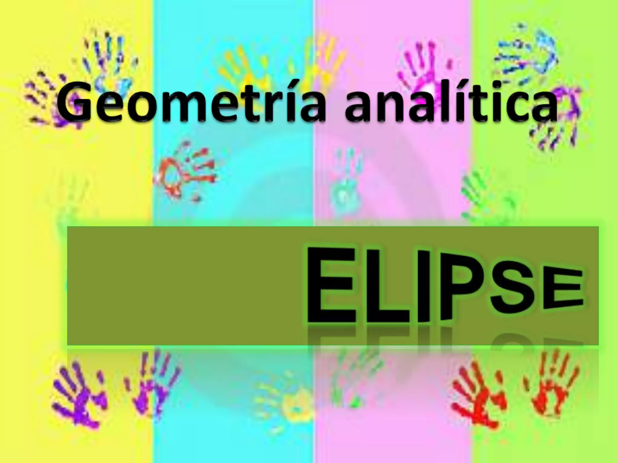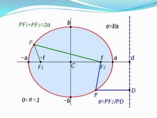 La elipse es una curva plana y cerrada simétrica respecto a dos ejes perpendiculares. Fue estudiada por los griegos y su nombre proviene de Apolonio de Perge. Un punto pertenece a una elipse si la suma de sus distancias a los dos focos es constante e igual a la longitud del eje mayor. La elipse puede representarse mediante ecuaciones cartesianas que relacionan sus semiejes y centro.