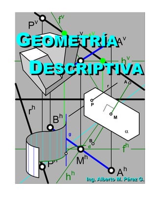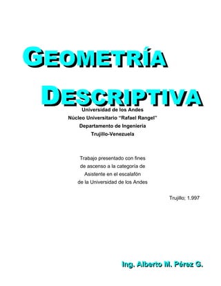 Este documento presenta un resumen de tres oraciones del libro "Geometría Descriptiva" de Alberto M. Pérez G. La primera oración introduce el tema del libro, la segunda menciona que contiene conceptos básicos de geometría descriptiva y métodos para obtener proyecciones, y la tercera oración indica que fue presentado para ascender en la Universidad de los Andes, Trujillo, Venezuela en 1997.