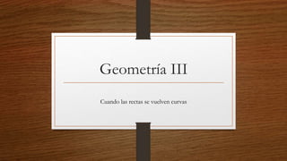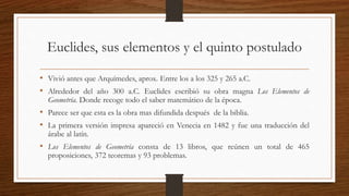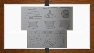 El documento aborda la evolución de la geometría desde Euclides y sus postulados hasta las geometrías no euclidianas, como la hiperbólica y elíptica, introducidas por Lobashevski y Riemann. También se discuten contribuciones de artistas del Renacimiento y el desarrollo de la geometría diferencial a partir de Gauss, que se centra en propiedades locales de curvas y superficies. Finalmente, se menciona el programa de Erlanger de Klein, que clasifica geometrías según las propiedades invariantes bajo transformaciones.