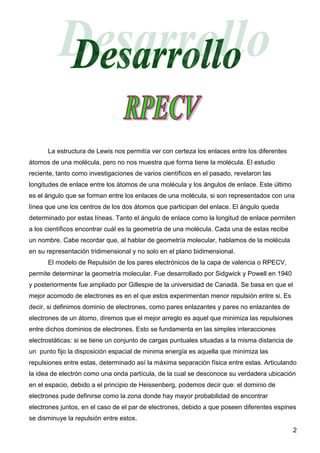 El documento presenta un resumen de la geometría molecular. Explica que la geometría molecular depende del ordenamiento tridimensional de los átomos y determina propiedades de la molécula. Luego describe los principales modelos para predecir la geometría, incluyendo el modelo de repulsión de pares electrónicos de la capa de valencia, el cual establece que la geometría produce la menor repulsión entre los dominios electrónicos. Finalmente, provee ejemplos de diferentes geometrías moleculares como el metano y el agua.