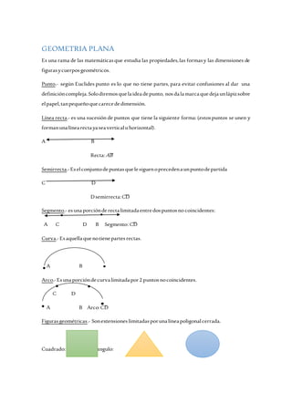 Este documento presenta los conceptos básicos de la geometría plana, incluyendo definiciones de puntos, líneas, figuras geométricas y ángulos. Explica la clasificación de triángulos y teoremas relacionados con ángulos, paralelas y congruencia de triángulos. También cubre conceptos como perpendiculares, semejanza y propiedades de figuras geométricas comunes.