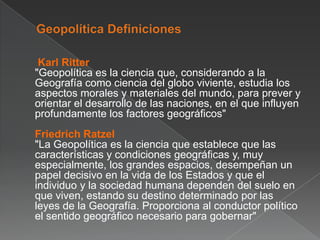 El documento presenta información sobre la geopolítica y su contexto en Venezuela. Explica conceptos clave como territorio, soberanía, población y elementos constitutivos del estado según la geopolítica. También resume partes fundamentales de la Constitución de Venezuela relacionadas a la definición del territorio y soberanía del país.