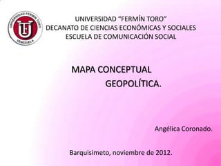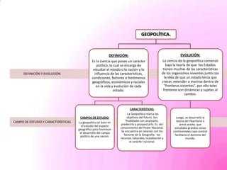 El documento aborda la geopolítica como la ciencia que estudia la relación entre estados, características dinámicas y factores geográficos, económicos y raciales. Se menciona la teoría del heartland y el análisis de áreas geográficas clave para el poder nacional y el dominio político. La geopolítica tiene como objetivos principal analizar, predecir y prospectar el futuro del espacio político.